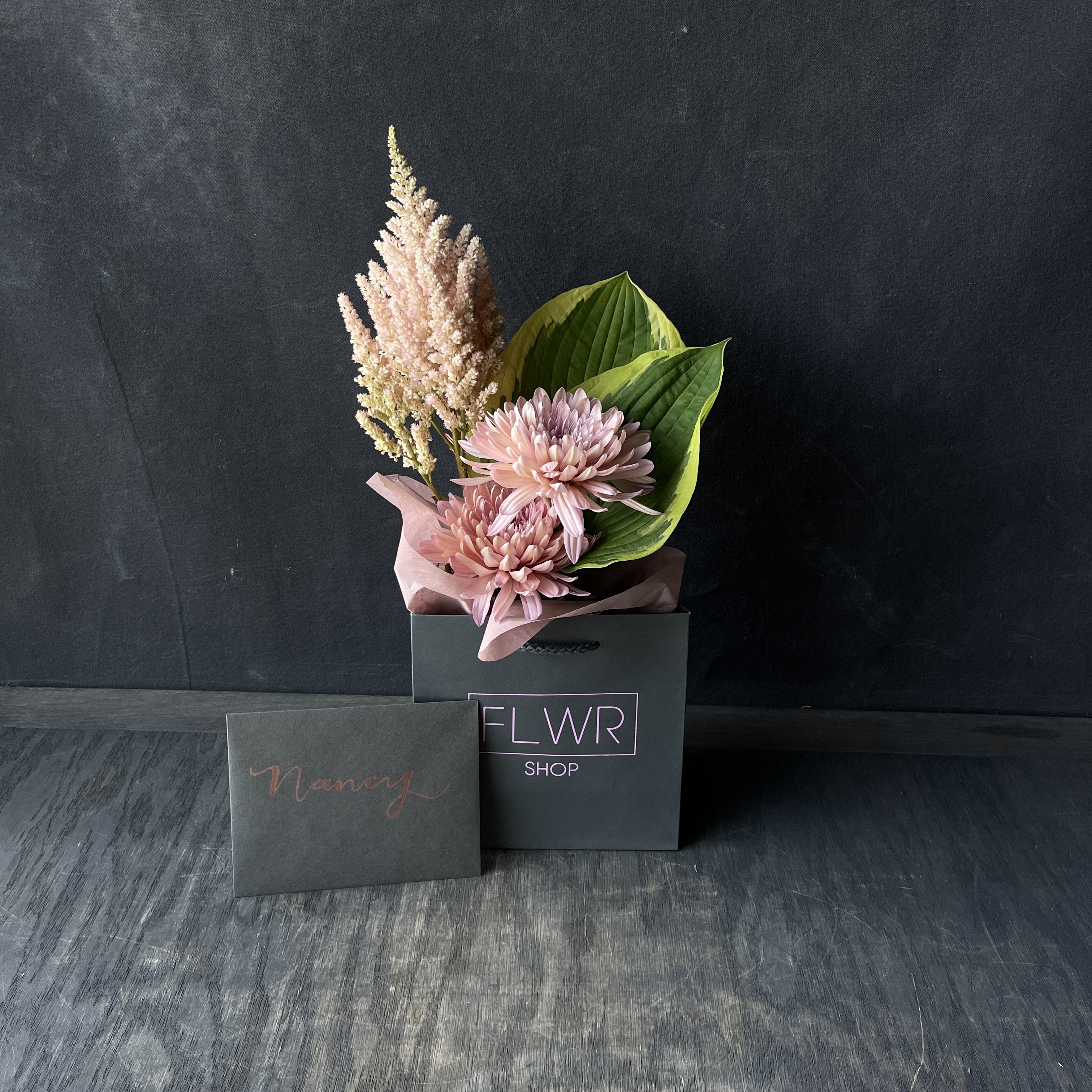 A tiny, bespoke flower arrangement, lovingly curated with the freshest blooms. A loving message composed by you and handwritten by us.